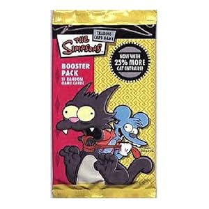 Product Description : From the Manufacturer11 random game cards add more of springfield's finest to your game and gain an edge on your opponents. Each 11-card booster pack contains all-new* character, scene, and action cards. Control the city that spawned the flaming moe! Each player must have his or her own 40-card deck to play the simpson's trading card game. Pick up any of the simpson's theme decks for complete game rules. Each pack is sold separately and package artwork may vary. Product Description : 11 random game cards add more of springfield's finest to your game and gain an edge on your opponents. Each 11-card booster pack contains all-new* character, scene, and action cards. Control the city that spawned the flaming moe! Each player must have his or her own 40-card deck to play the simpson's trading card game. Pick up any of the simpson's theme decks for complete game rules. Each pack is sold separately and package artwork may vary.
